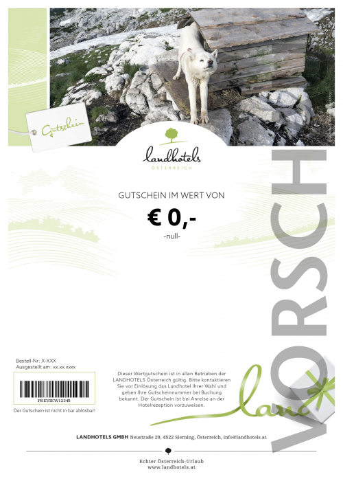Dieser LANDHOTELS Wertgutschein ist mein Beitrag zu Deinem wohlverdienten Urlaubsglück: Ich schenke Dir „Echten Österreich-Urlaub“! Suche Dir einfach eines der LANDHOTELS Österreich aus - und genieße eine glückliche, erholsame Zeit am Land.