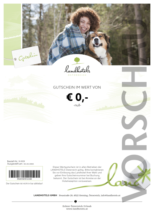 Dieser LANDHOTELS Wertgutschein ist mein Beitrag zu Deinem wohlverdienten Urlaubsglück: Ich schenke Dir „Echten Österreich-Urlaub“! Suche Dir einfach eines der LANDHOTELS Österreich aus - und genieße eine glückliche, erholsame Zeit am Land.